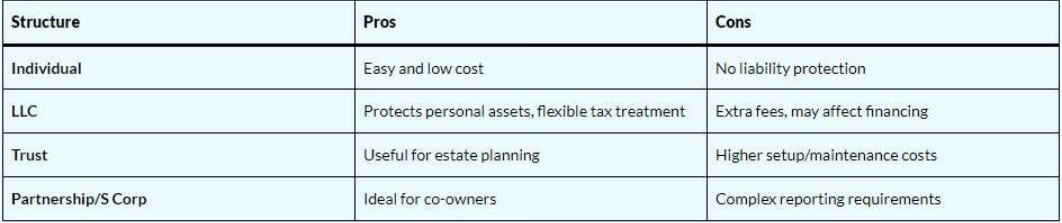 How you own the property affects both liability and taxes: